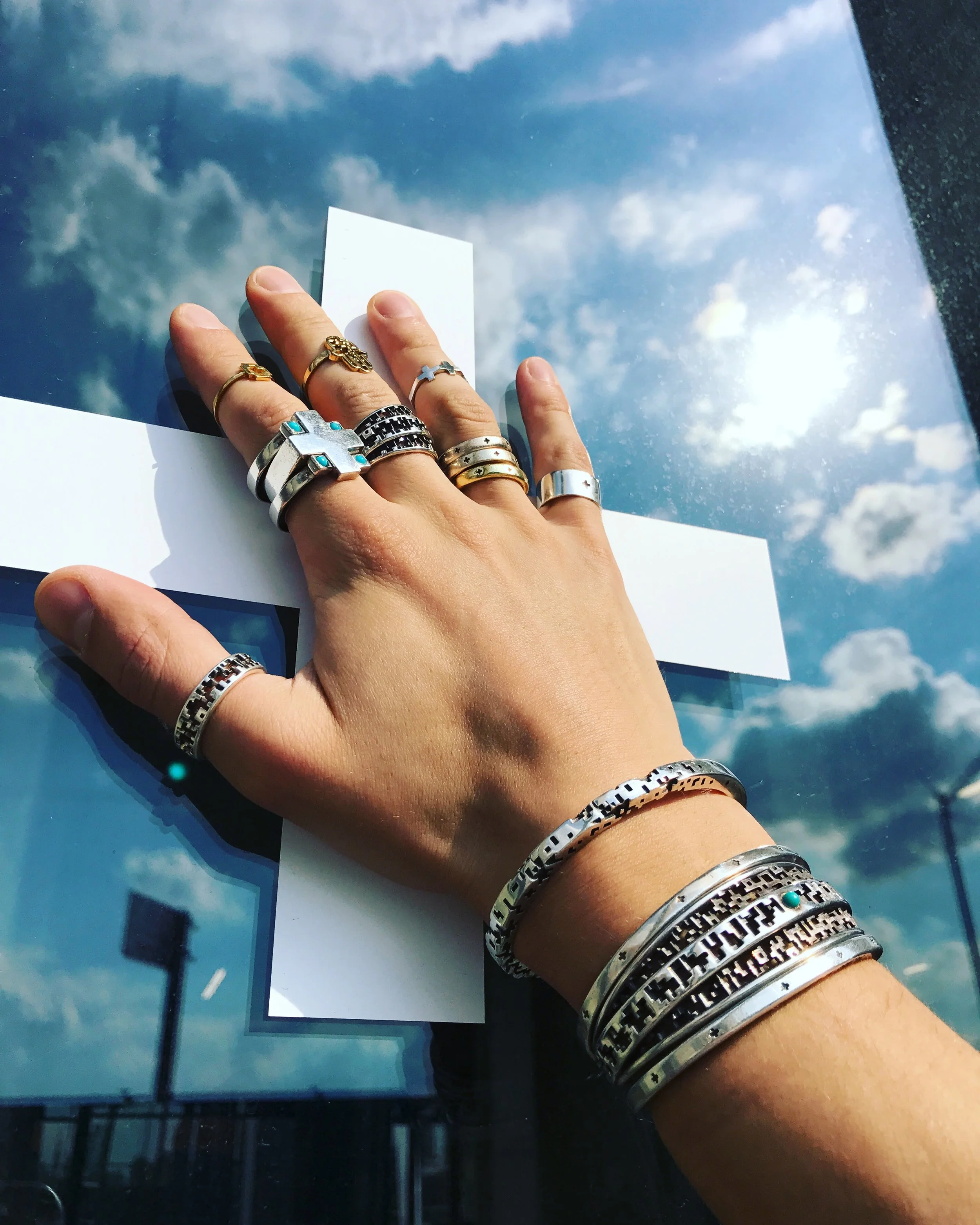 after a very existential moment of appreciating all the blessings life had given him thus far, he cried tears of joy for an entire day of bliss. days later he represented his newfound trade by getting the plus ring outlined and tattooed onto his right wrist. Since then, designing a jewelry collection with a positive message is his pride + passion.